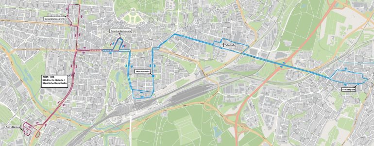 Die Linie 1 verbindet das Naturkundemuseum mit dem Generallandesarchiv, dem ZKM und Hallenbau und RetroGames e.V. in einer 10 Minuten Taktung.