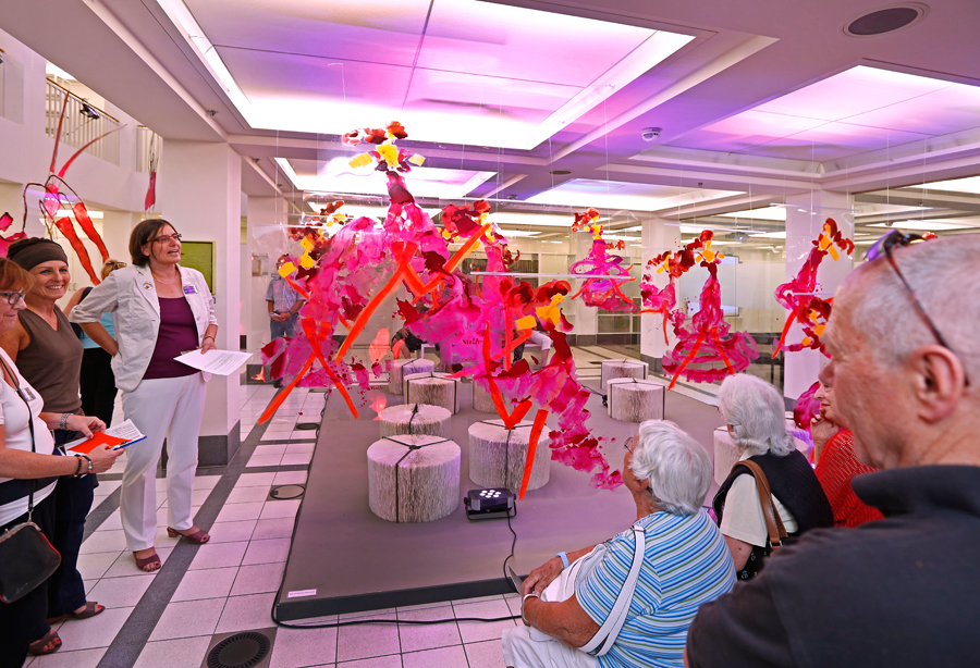 Zweiter Kultur-Hotspot des Abends war der Hallenbau: Mit ZKM | Zentrum für Kunst und Medien, Städtischer Galerie, Hochschule für Gestaltung und „KunsthalleKarlsruhe@ZKM“ konnten die Besucherinnen und Besucher gleich vier Kulturinstitutionen in einem Quartier entdecken. Als eine weitere „Gast-Institution“ neben der Staatlichen Kunsthalle kann das Karlsruher Institut für Technologie (KIT) zählen. Im Sinne des gemeinsamen Denkens und Forschens und der engen Kooperation mit dem KIT, zeigt das ZKM die Ausstellung „200 Jahre KIT. 100 Objekte. Teile des Ganzen“. Besonders beeindruckend ist dabei der interaktive MIC- Trainer, ein Simulationssystem für minimal-invasive Eingriffe.